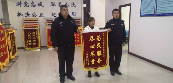 ( 通讯员:李建东) 为民服务,尽职尽责。11月26日,一起交通事故的当事人韩女士,将一面锦旗送到邯郸市交巡警支队广平大队事故处理中队,对热情、公正处理事故的民警表示感谢。